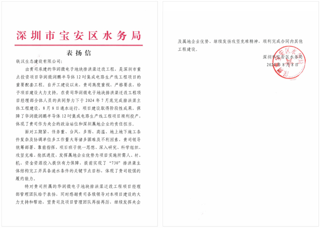 寶安區水務局《表揚信》指出,自項目開工建設以來,鐵漢建設高度重視、嚴格要求,給予項目建設大力支持。期間,面對工期緊、任務重,臺風、多雨、高溫、地上地下施工條件復雜及協調單位多、工作量大等諸多困難及不利因素,鐵漢建設統籌部署、靠前指揮,項目班子科學組織、攻堅克難、搶抓進度,發揮屬地企業優勢為項目實施所需人、材、機、資金資源投入提供有力保障,提前實現了“730”排洪渠主體結構完工并具備通水條件的關鍵節點目標,體現了較強的履約能力。88日,項目順利通水運行,保障了華潤微潤鵬半導體12吋集成電路生產線工程項目順利投產,體現了作為央企的政治站位和深圳屬地企業的責任擔當。