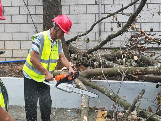 新坡鎮救災現場,中節能鐵漢小分隊根據當地政府部門統一部署,在分配區域全速搶通阻斷路段,爭分奪秒對倒伏樹木進行分解清理,并及時清理道路垃圾,開展衛生整治工作。