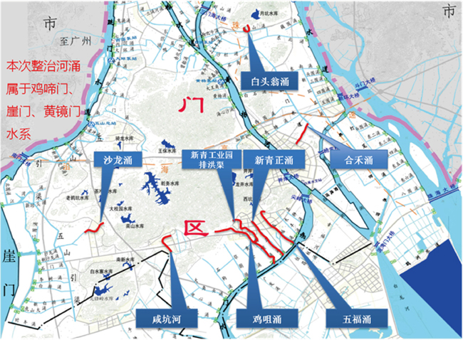 項目位于珠海市斗門區,施工范圍分布在三個鎮區,由8條河涌組成,分別為白蕉鎮白頭翁涌、合禾涌,井岸鎮五福涌、新青正涌、新青工業園排洪渠、雞咀涌,乾務鎮咸坑河、沙龍涌。工程主要建設內容涵蓋河道控源截污工程、內源清淤及底質改良工程、面源污染控制工程、水生態凈化工程、生態景觀提升工程、改善河道水動力工程、智慧水務系統建設工程、應急工程等,總治理長度21.05公里。
